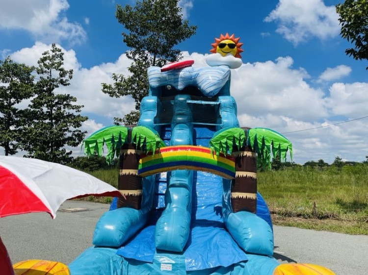 Bring the fun and excitement of the beach to your next event with this vibrant inflatable water slide! This tropical-themed slide features bright blue wave designs, cheerful palm trees, and a colorful rainbow archway. At the top, a smiling sun with sunglasses adds a playful touch, making it perfect for summer parties, birthdays, school events, or community gatherings.